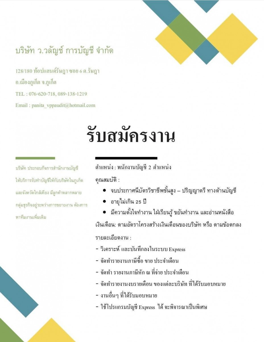 บริษัท ว.วลัญช์ การบัญชี จำกัด รับสมัครพนักงานบัญชี 2 ตำแหน่ง