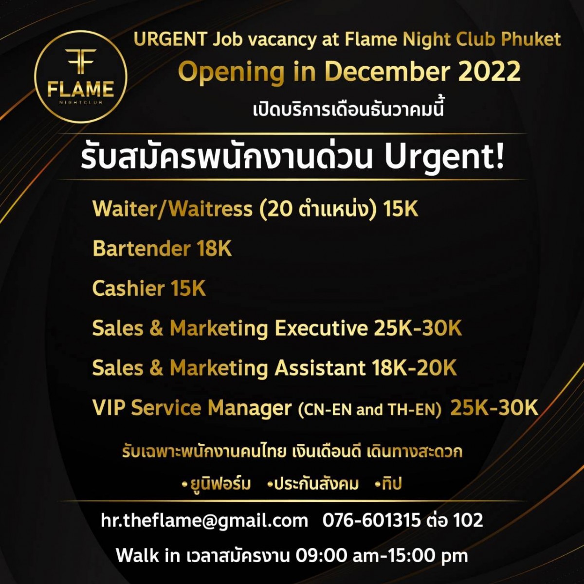 Flame Night Club Phuket รับสมัครพนักงานด่วน !!!