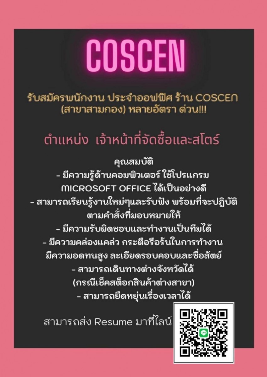ร้าน COSCEN (สาขาสามกอง) รับสมัครตำแหน่งงานว่าง