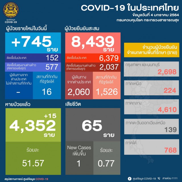 สถานการณ์การติดเชื้อ COVID-19 วันจันทร์ที่ 4 มกราคม 2564