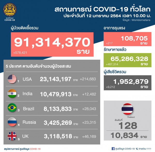 - ยอดผู้ติดเชื้อรวม 91,314,370 ราย