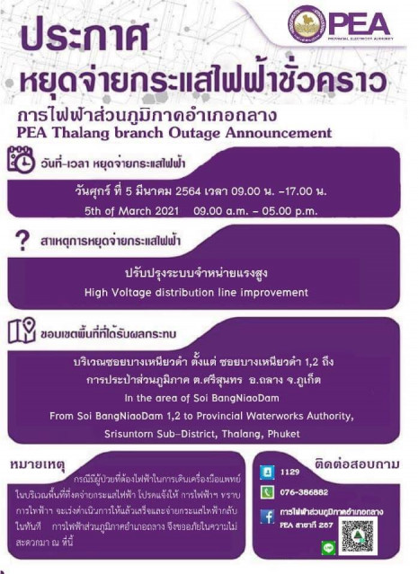 ข่าวประชาสัมพันธ์จากการไฟฟ้าส่วนภูมิภาคอำเภอถลาง เรื่อง หยุดจ่ายกระแสไฟฟ้าชั่วคราว วันศุกร์ที่ 5 มีนาคม 2564 ตั้งแต่เวลา 09.00 - 17.00 น. เพื่อปฏิบัติงานด้านแรงสูง