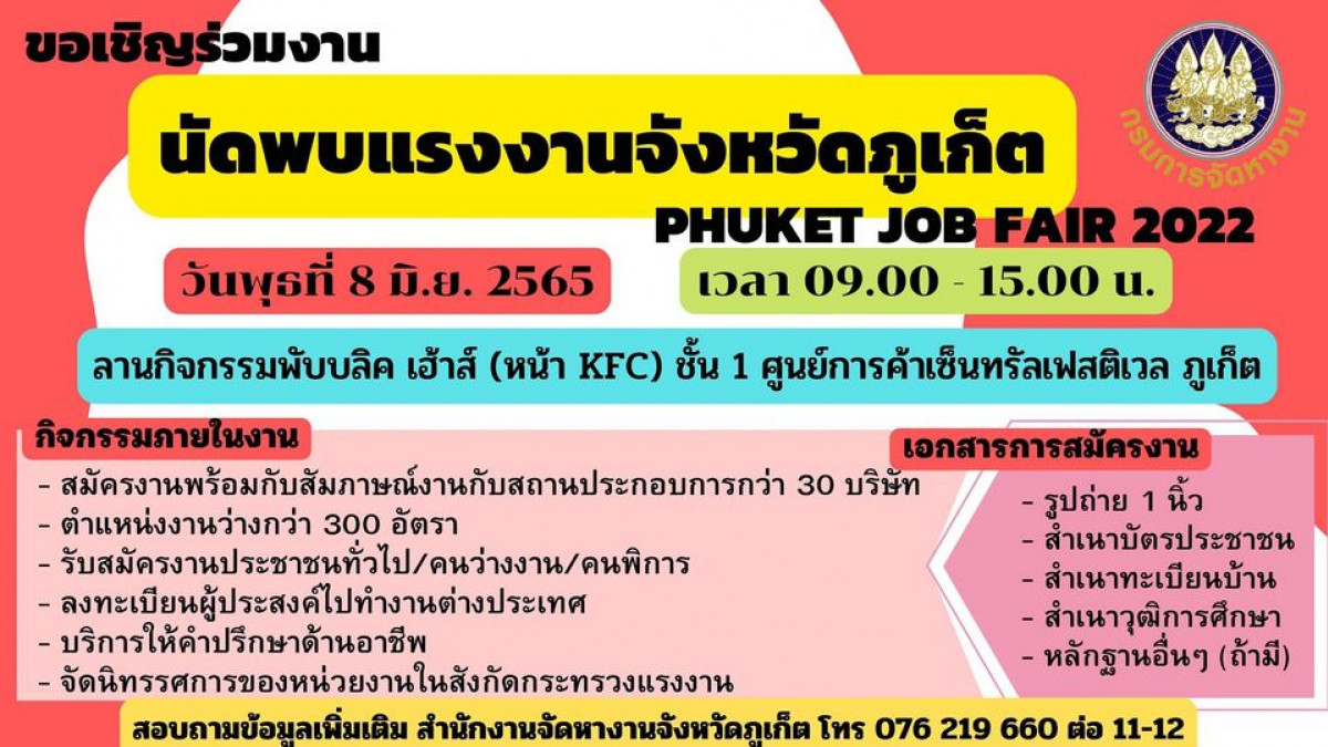 ขอเชิญร่วมงาน นัดพบแรงงานใหญ่ "PHUKET JOB FAIR 2022"