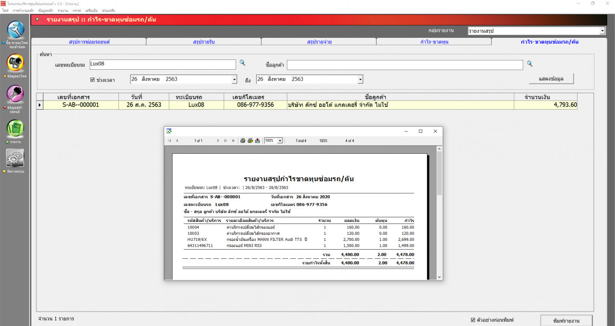 - Report สรุป : สรุปกำไร - ขาดทุนซ่อมรถ/คัน